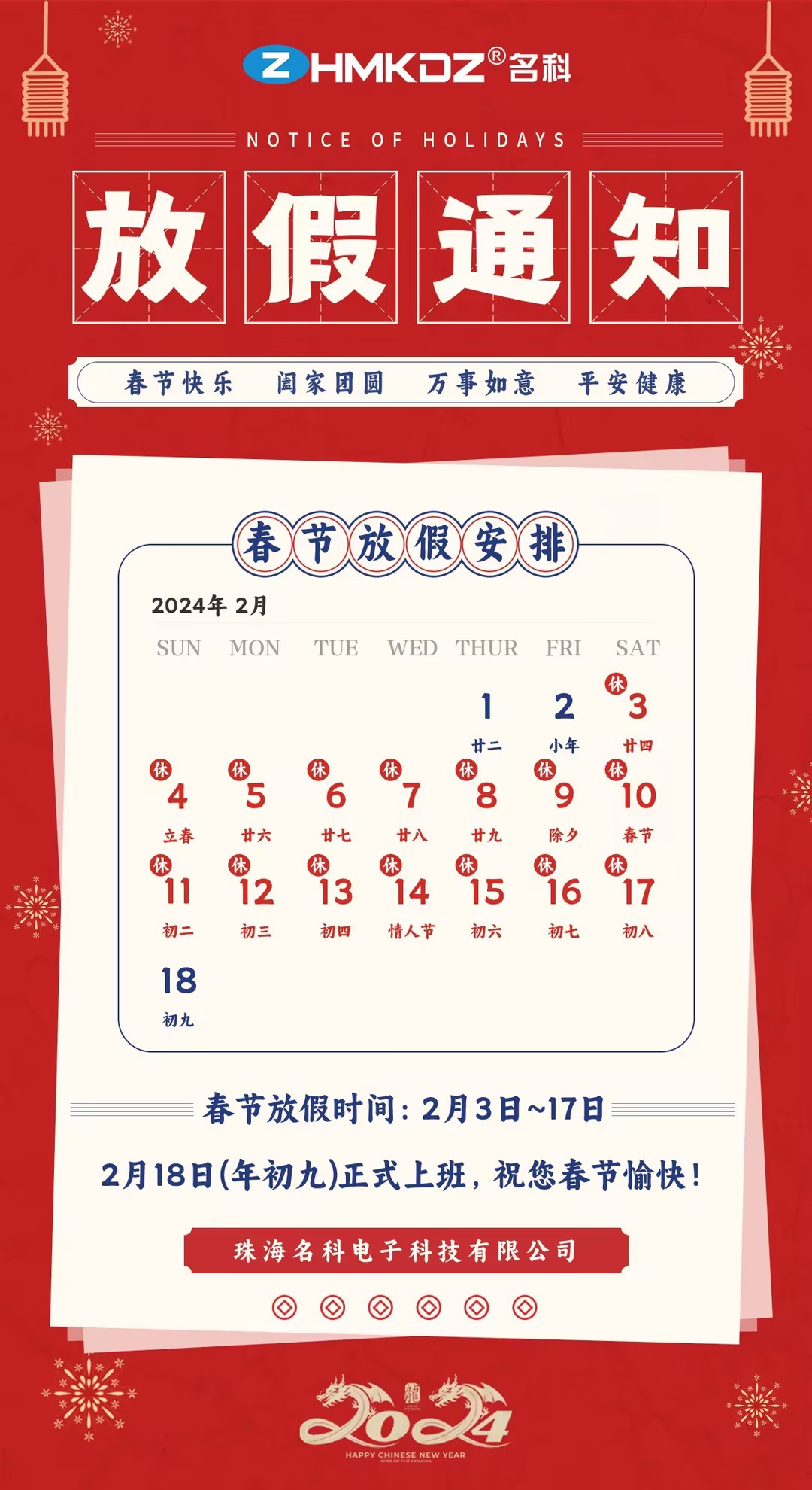 為了能與家人共度這個溫馨的節(jié)日,我們將從2024年2月3日至2024年2月17日進行春節(jié)放假。期間,我們的辦公場所將暫時關(guān)閉,暫停日常業(yè)務(wù)。